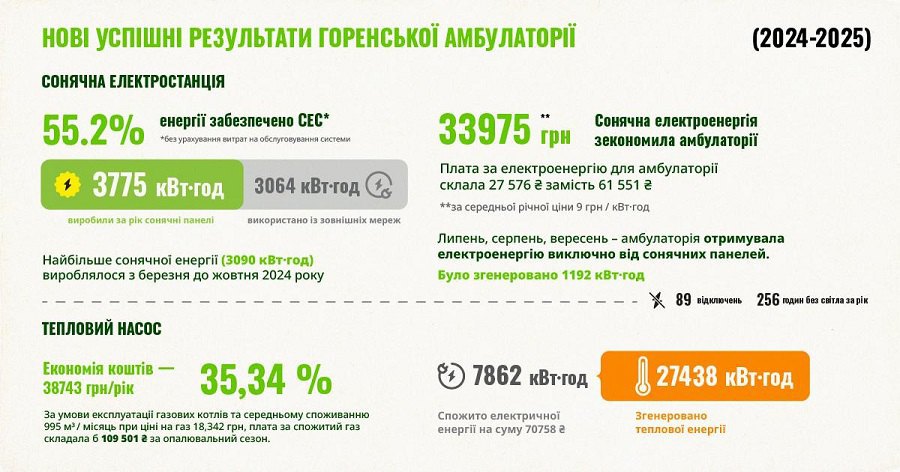 Під час відновлення амбулаторії було також змінено систему опалення з газової на геотермальну. Завдяки тепловому насосу потужністю 20 кВт, який використовує енергію землі, медзаклад у Горенці можна вважати успішним прикладом комплексного зеленого відновлення. Тепловий насос зекономив амбулаторії понад 36% коштів у порівнянні із газовим опаленням.