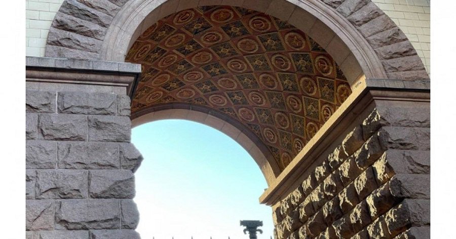 У двох арках Київради досі красуються серпи та молоти, а на будинках навпроти не прибрали зірку на шпилі та серпи з молотами на воротах.