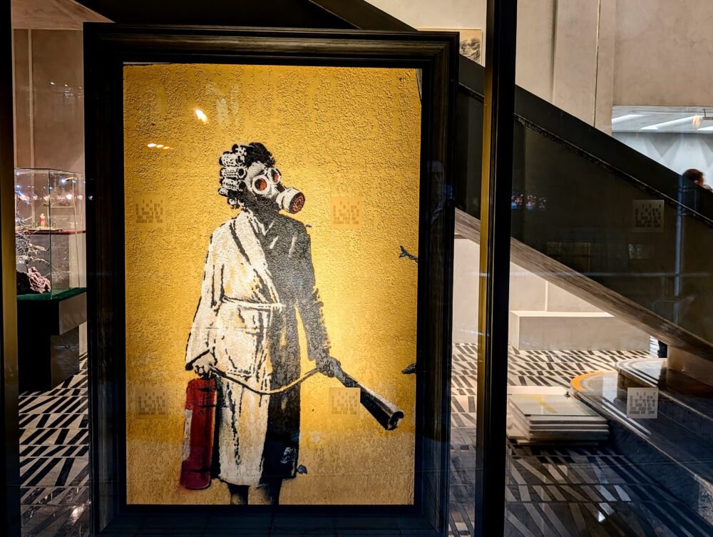 Як стінопис Бенксі з Гостомеля потрапив у приватний галерейний простір у Львові? Історія «Жінки з протигазом» доволі складна. Спочатку її хотіли викрасти, зрізавши зі стіни. Поліція затримала зловмисників, вилучила роботу для проведення слідства й передала на зберігання в Національний заповідник «Києво-Печерська лавра». Щоб привезти мурал у ZAG, організатори домовлялись і з громадою Гостомеля (як правовласницею), і з Національним заповідником (як зберігачем). Офіс Бенксі погодив експонування стінопису за умови, що він буде доступний для всіх, тобто стоятиме в публічному місці. Тож мурал розмістили у вікні при вході, щоб його було видно назовні.