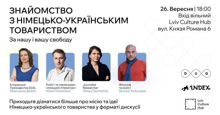 26 вересня у Lviv Culture Hub відбудеться вечір Німецько-українського товариства під гаслом «За нашу та вашу свободу». Подія організована спільно з Deutsch-Ukrainische Gesellschaft, INDEX: Інститут документування і взаємодії та Lviv Culture Hub.