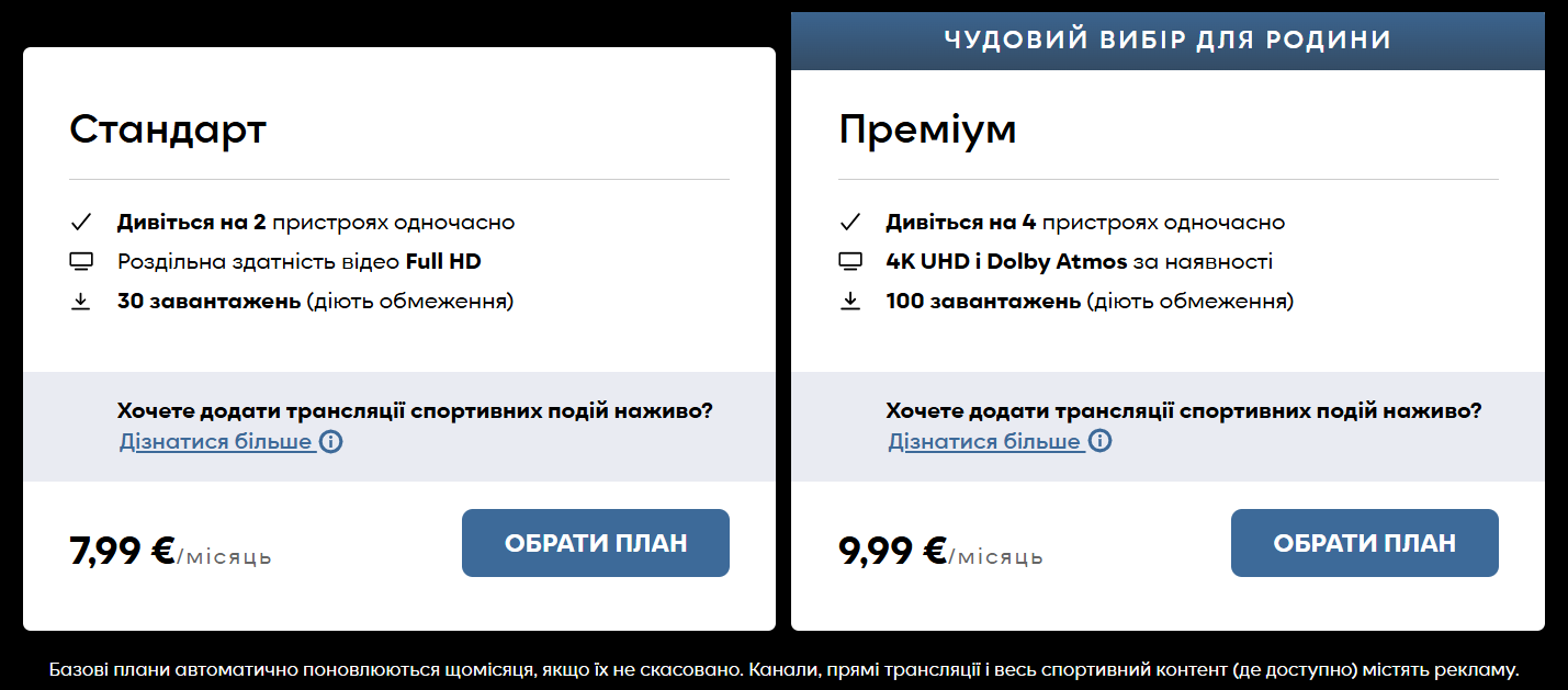 Преміум-план підтримує чотири пристрої одночасно у форматі 4K UHD та дозволяє завантажувати до 100 епізодів. Ціна становить €9,99 на місяць (від 485 грн).