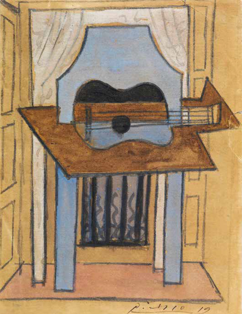 Пікассо написав "Натюрморт з гітарою" у 1919 році. Картина виконана гуашшю та олівцем і має розмір 12,7 на 9,8 сантиметра.