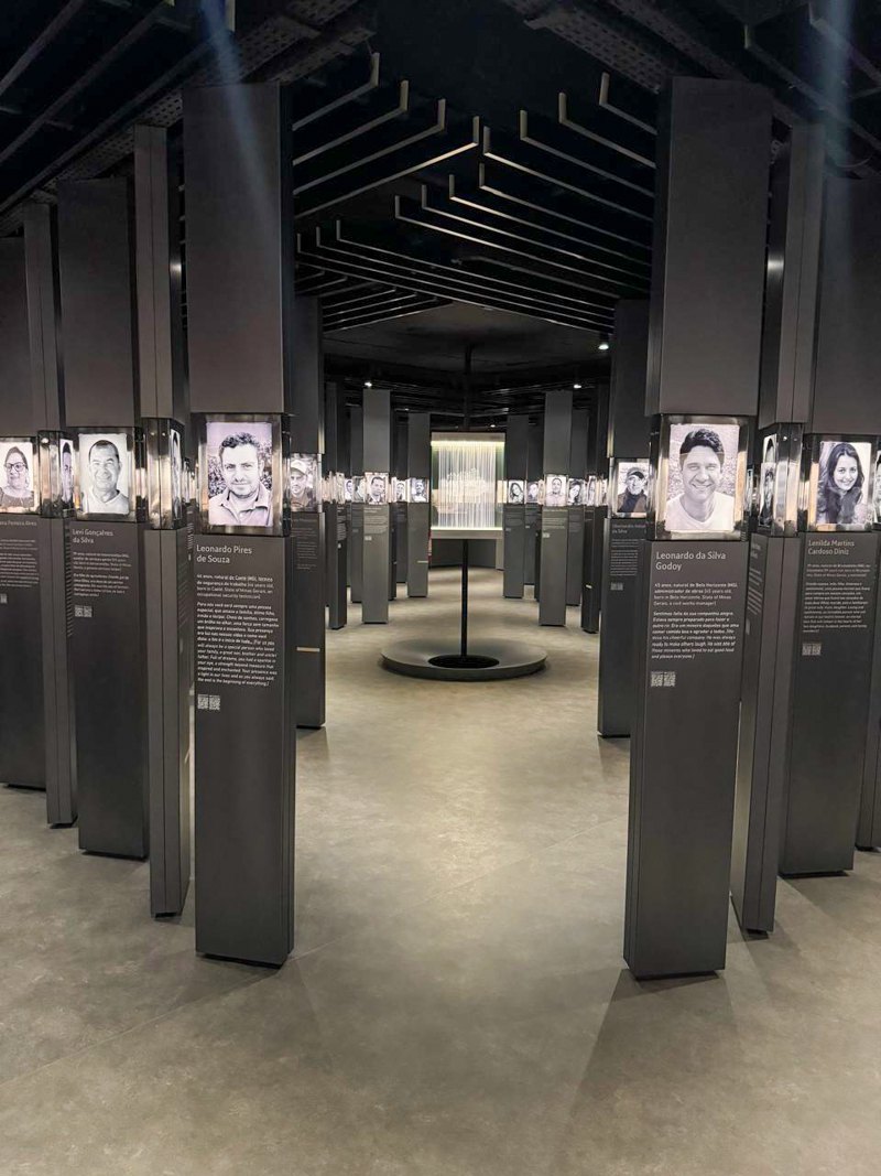 Не доходячи до середини шляху, в Меморіалі відкриваються три простори. Один ліворуч і два праворуч. Ліворуч — пам'ять. Праворуч — свідчення та священне місце, де зберігають віднайдені останки жертв. У просторі пам'яті родини вшановують своїх близьких: там розміщені їхні портрети, дорогі їм речі; емоції співпереживання підсилює зворушлива музика бразильського композитора Берни Сеппаса. У просторі свідчень трагічна історія повторюється знову і знову за допомогою відеозаписів з камер відеоспостереження компанії. Вони зафіксували майже всі ракурси жахливих подій, що розгорнулися того дня. Уздовж дороги пам’яті течуть два потоки, які зрештою зливаються, перш ніж упасти в меморіальне озеро. Нахилена під кутом квадратна конструкція символізує руйнівний дисбаланс людського втручання в навколишній ландшафт, катастрофічні наслідки зазіхання на природу, нехтування повагою до неї. Ціна цих дій — життя.
