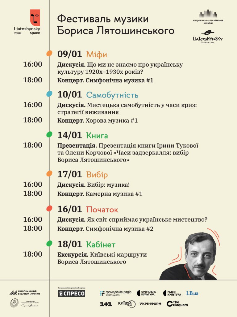 9 січня – 18 січня 2026 у Києві відбудеться фестиваль музики Бориса Лятошинського, заснований Національною філармонією України та Фундацією Лятошинського.