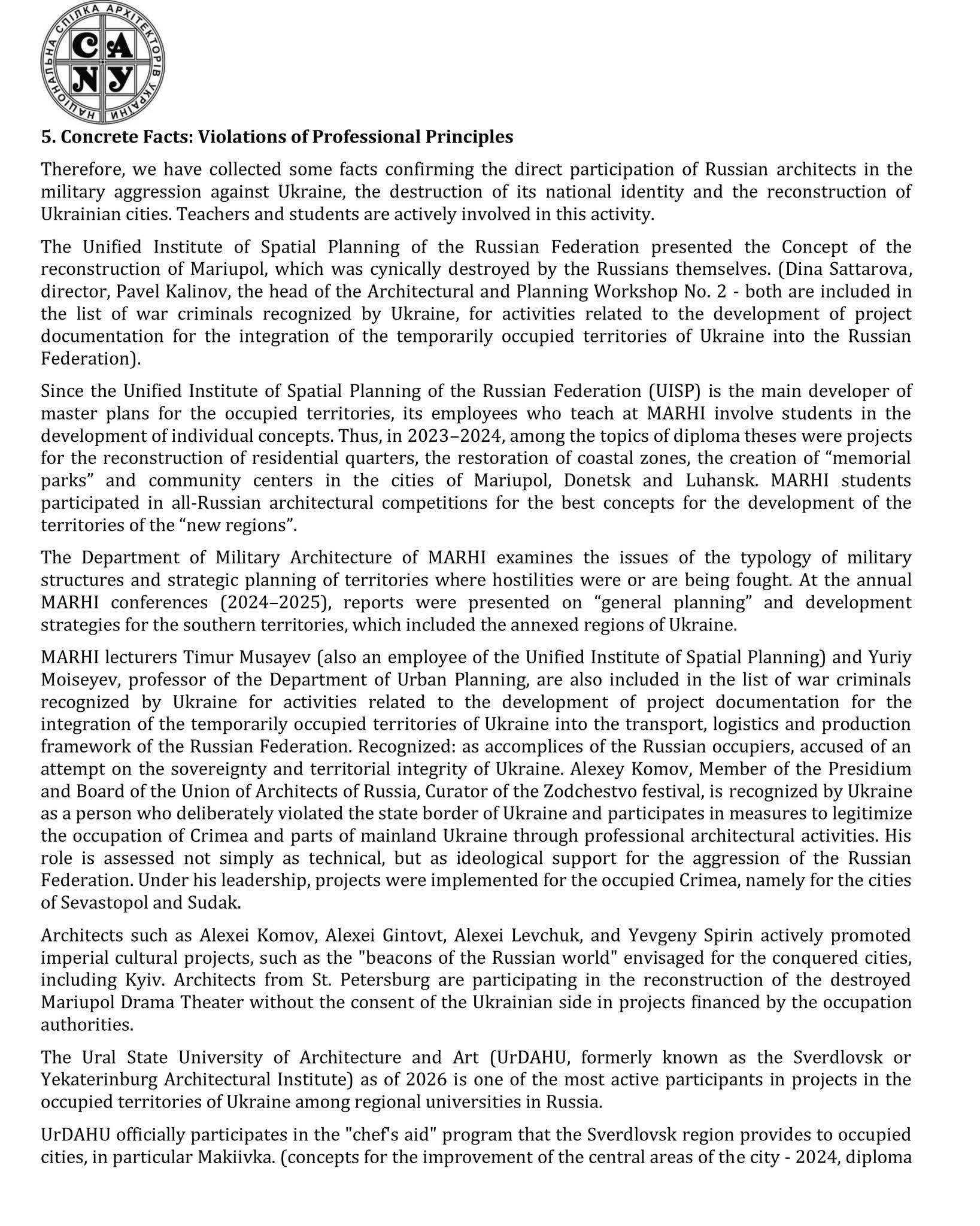 Документ містить докладно задокументовані факти участі російських архітекторів, освітніх інституцій та студентів у реалізації політики окупації тимчасово захоплених територій України. Йдеться про інтеграцію цих територій у просторову, інфраструктурну та ідеологічну систему РФ.