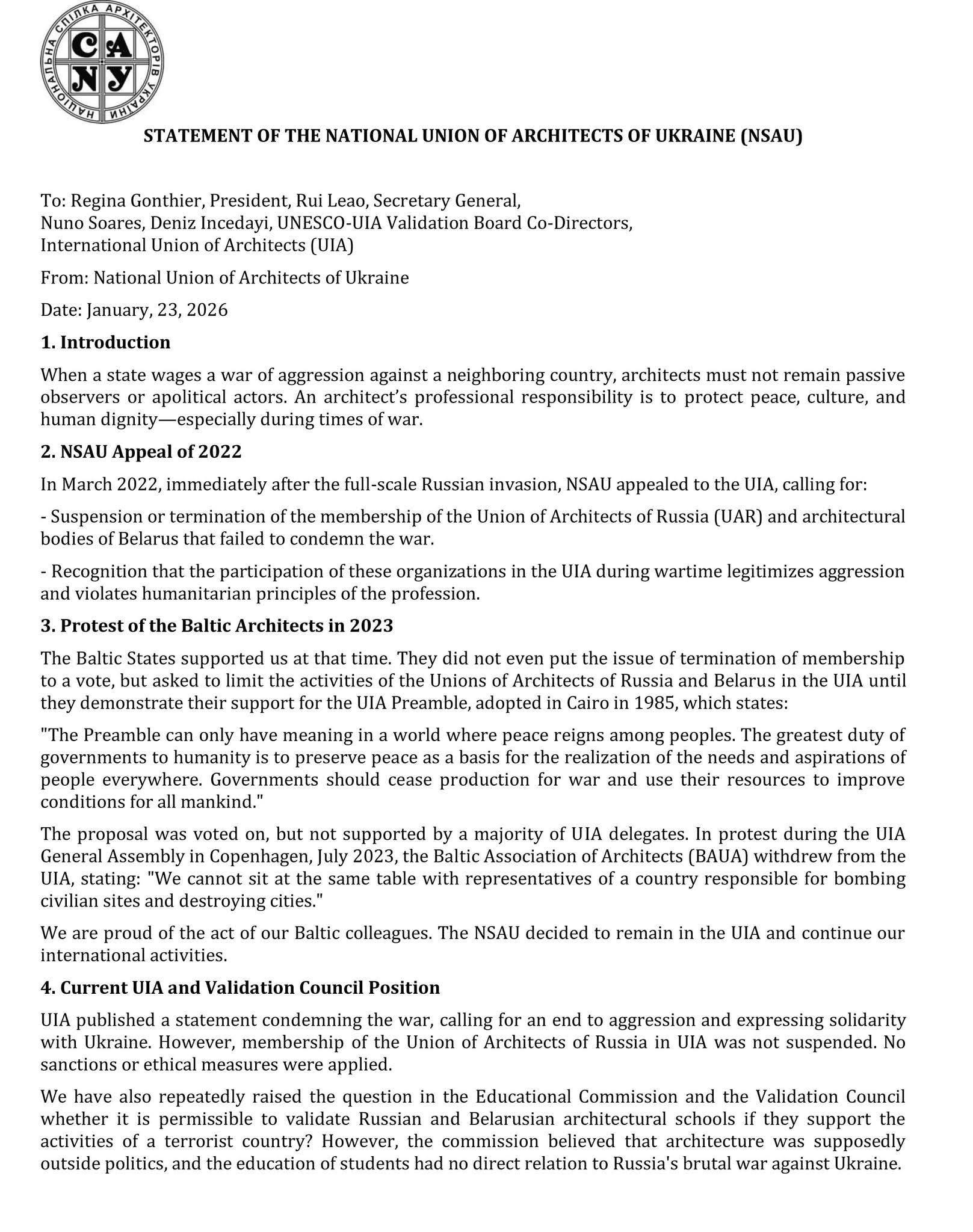 Національна спілка архітекторів України (НСАУ) оприлюднила офіційну заяву до керівництва Міжнародної спілки архітекторів (UIA) та Валідаційної ради UIA–UNESCO із вимогою припинити валідацію російських і білоруських архітектурних шкіл, а також призупинити членство відповідних професійних організацій у міжнародній архітектурній спільноті.