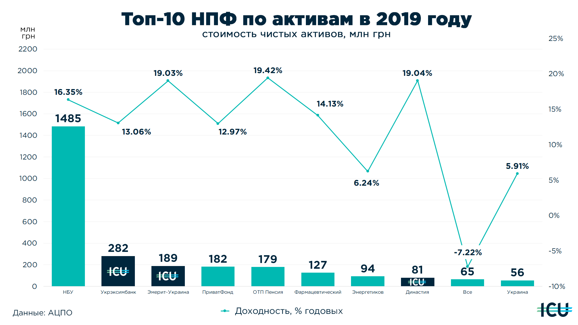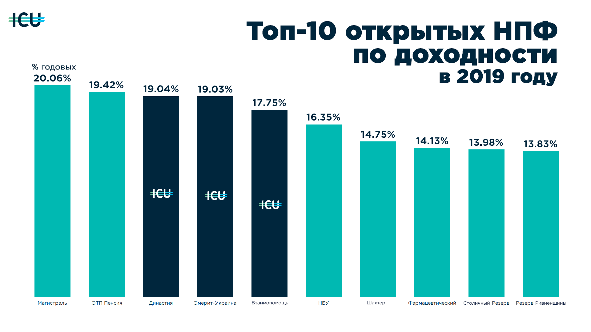 Відкриті НПФ «Династія», «Емеріт-Україна» і «Взаємодопомога» з прибутковістю 19.04 %, 19.03 % і 17.75 % відповідно посіли 2, 3 і 4-е місця серед усіх зареєстрованих відкритих НПФ у країні, а корпоративний НПФ «Укрексімбанк» під управлінням ICU з показником 13.06 % посів друге місце серед корпоративних пенсійних фондів.