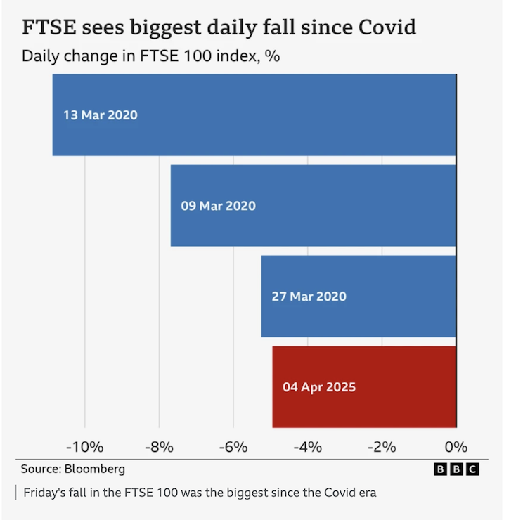 У п'ятницю FTSE 100 закрився з падінням у 5 %, а це найгірший показник з моменту пандемії коронавірусу 2020-го року.