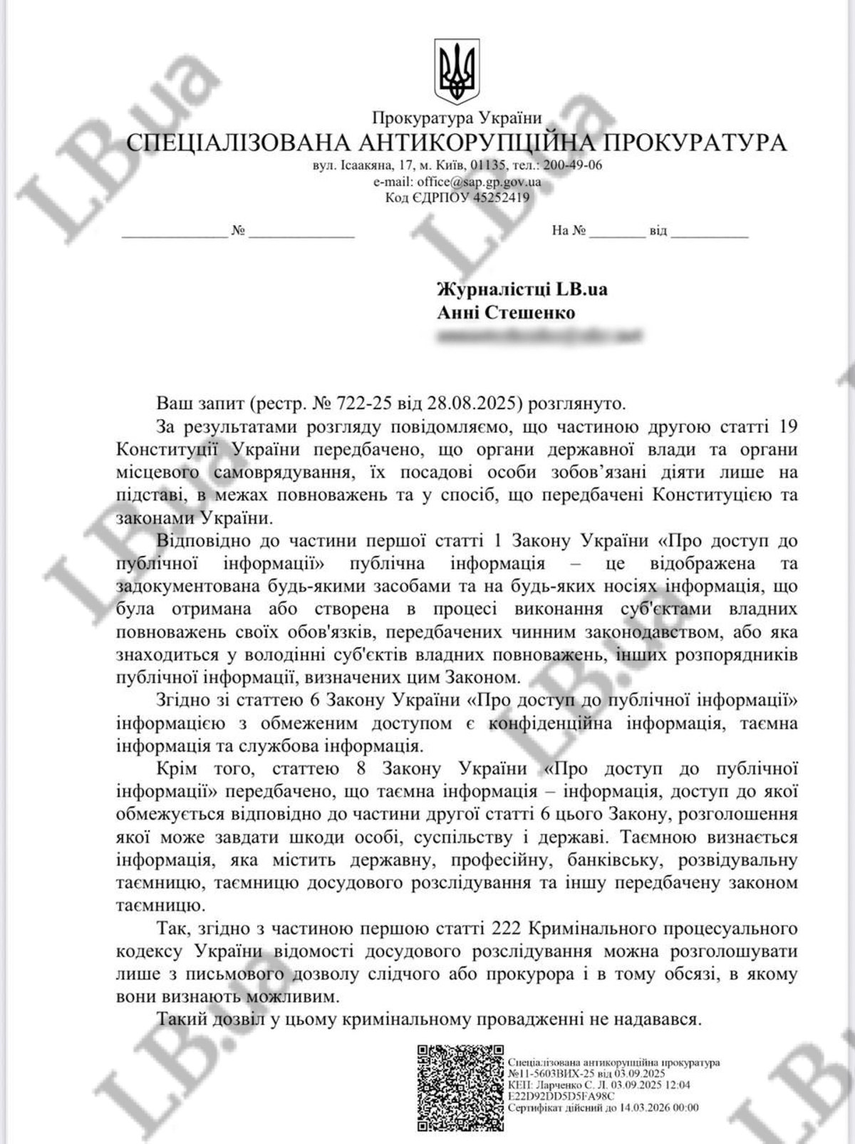 У відповіді на інформаційний запит LB.ua САП посилається на низку законодавчих норм, які обмежують доступ до інформації. Зокрема, йдеться про: