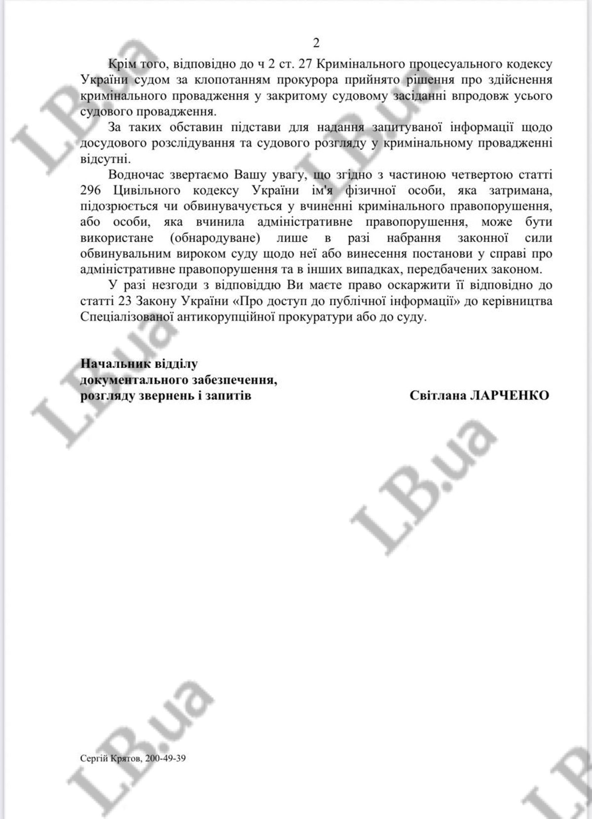 У своїй відповіді прокуратура також звернула увагу на статтю 296 Цивільного кодексу України. «Ця стаття забороняє використовувати (обнародувати) ім’я особи, підозрюваної чи обвинуваченої у вчиненні злочину, до набрання законної сили обвинувальним вироком суду», - йдеться у відповіді на запит.