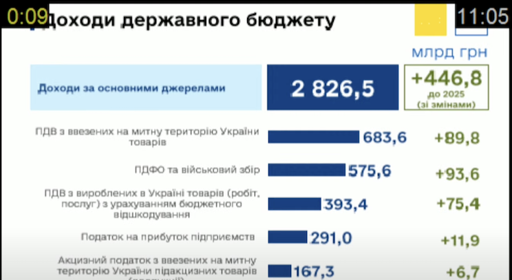 "Доходи державного бюджету складуть 2 трлн 826,5 млрд грн і зростуть порівняно з 2025 на 446,8 млрд грн або 18,8 %", – сказав міністр.