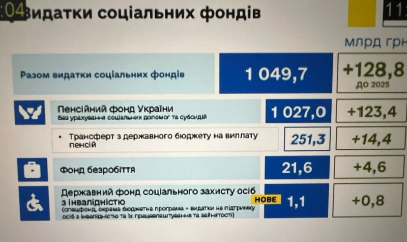 Разом на фінансування видатків соціальних фондів у проєкті бюджету передбачили 1049,7 млрд грн (+128,8 млрд грн порівняно з 2025 роком). З них бюджет Пенсійного фонду, без урахування соціальних допомог і субсидій — 1027 млрд грн (+123,4 млрд грн). Трансферт з держбюджету на виплату пенсій — 251,3 млрд грн.