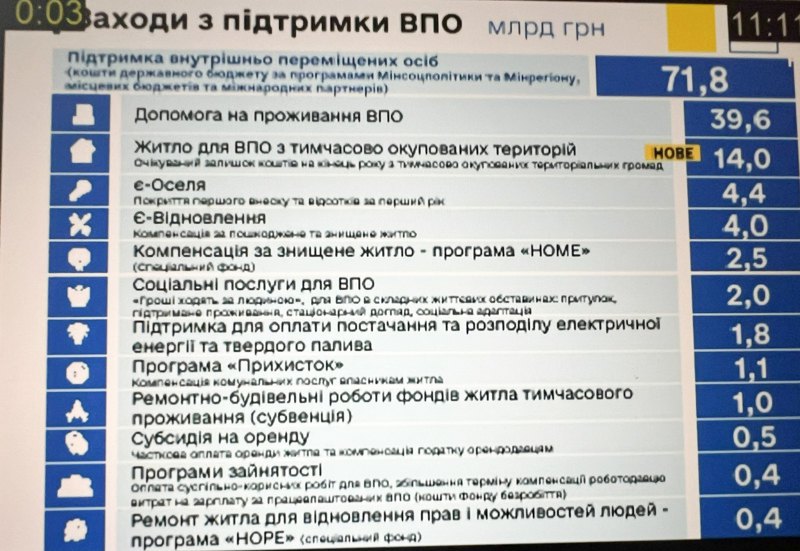 На виплати і програми підтримки для внутрішньо переміщених осіб заклали 48,4 млрд грн, зокрема, це допомога на проживання, єОселя, соціальна оренда, прихисток тощо.