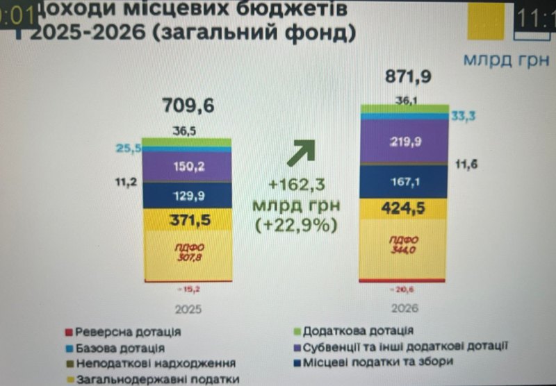 За інформацією Свириденко, «загальні доходи громад складуть 871,9 млрд грн (+162,3 млрд грн до 2025 грн). У тому числі міжбюджетні трансферти місцевим бюджетам із загального фонду держбюджету у 2026 році становитимуть 289,3 млрд грн».