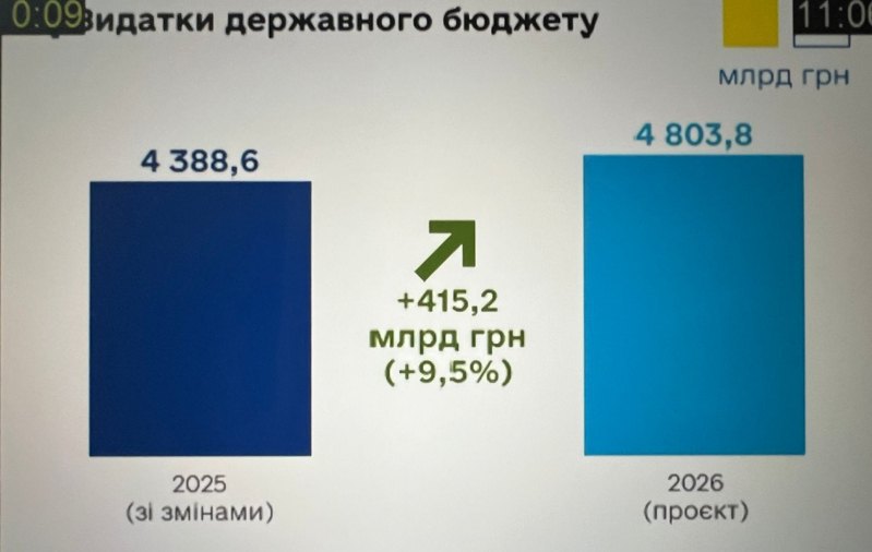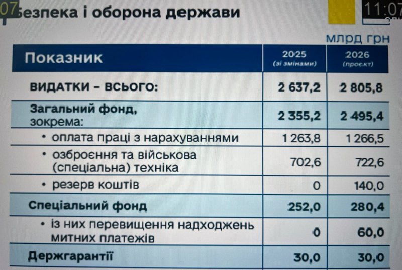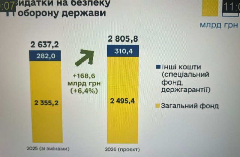 Загалом на безпеку й оборону держави в проєкті бюджету-2026 передбачено 2,8 трлн грн (+168,5 млрд грн, або 6,5 % до 2025 року).