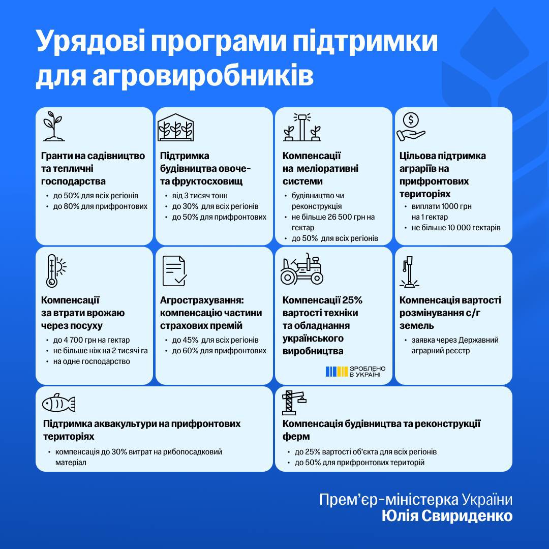 Загалом уряд реалізує комплекс програм: гранти, компенсації, прямі виплати, підтримку тваринництва й страхування. Для посилення енергонезалежності в умовах обмеженого електропостачання діють пільгові кредити, зокрема «5-7-9%» і кредити під 0% до 10 млн грн на енергообладнання.