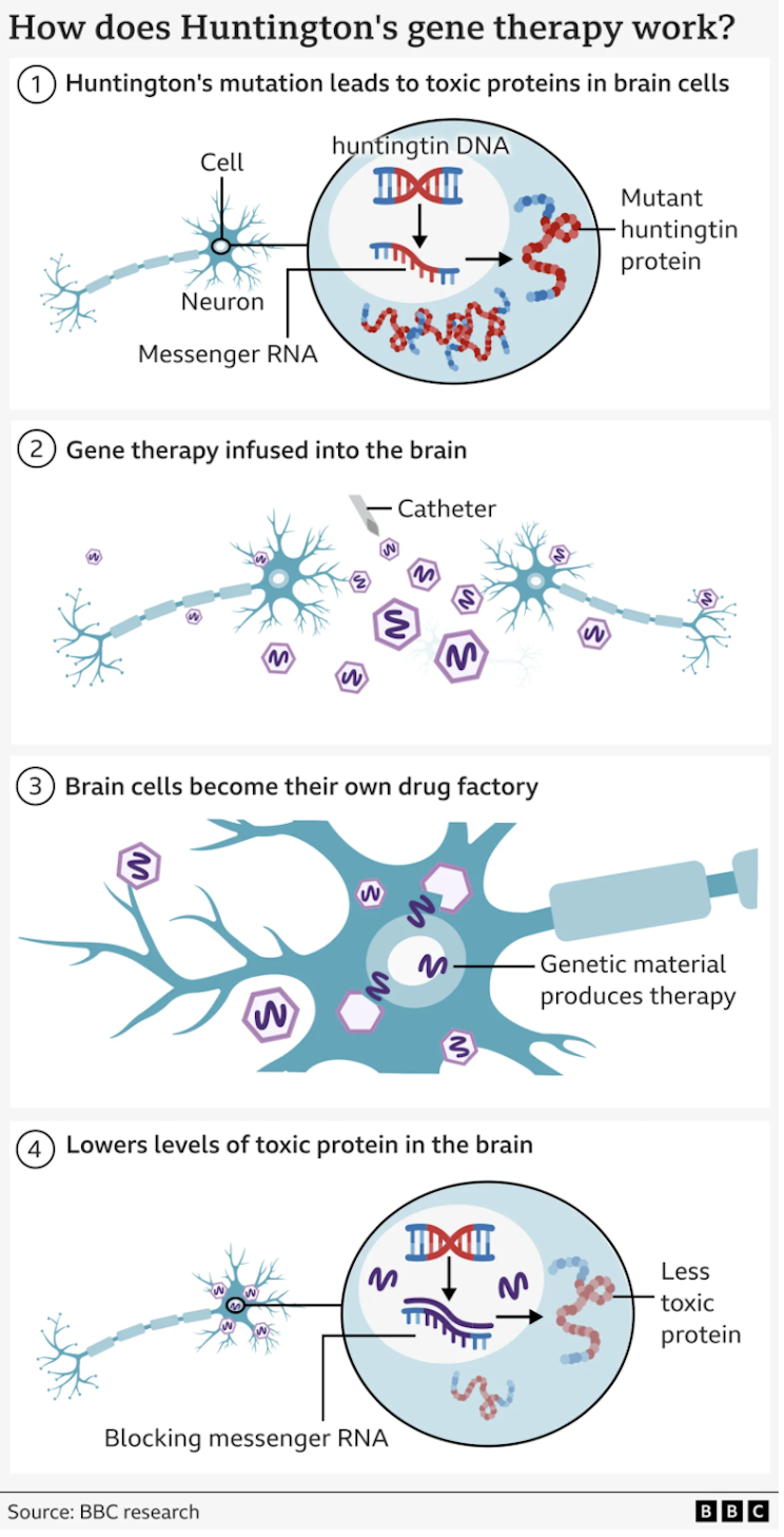 Хворобу спричиняє помилка в частині ДНК, названа гатінгтон-геном. Якщо захворювання є в одного з батьків, то вірогідність, що і дитина матиме цю хворобу, сягає 50 %. Мутація перетворює протеїн, необхідний для мозку, в "убивцю" нейронів. Метою лікування є назавжди зменшити рівень цього токсичного білка. Терапія використовує передові методи генетичної медицини, що поєднують генну терапію та технології приглушення генів.