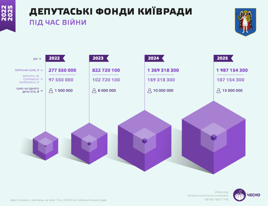 Від початку повномасштабного вторгнення видатки на депфонди столиці зростали щороку. 2022-го кожен депутат міг “допомогти” виборцям на 1,5 млн грн, 2023-го — на 6 млн грн, 2024-го — на 10, а 2025-го — на 15.