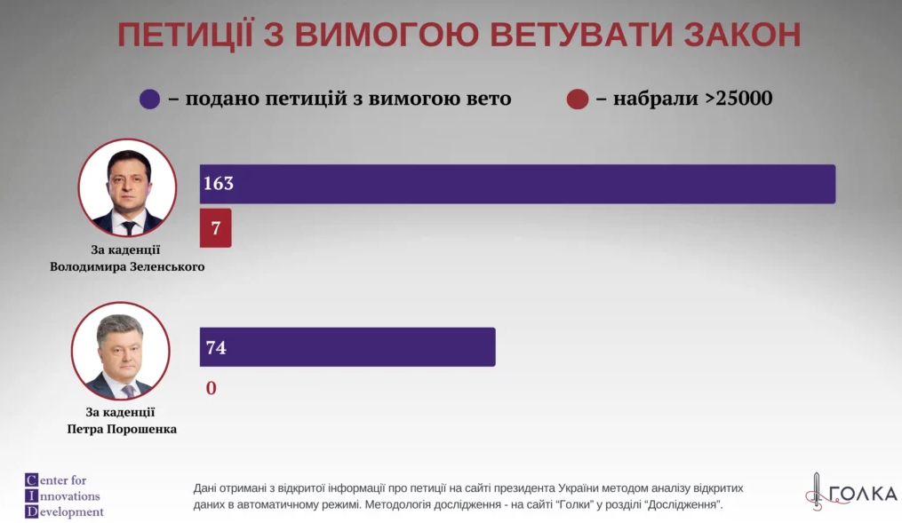 Зазначається, що лише 7 петицій до Зеленського з вимогою ветувати прийнятий Верховною Радою закон набирали понад 25 000 підписів, що зобов’язує президента надавати громадянам відповіді.