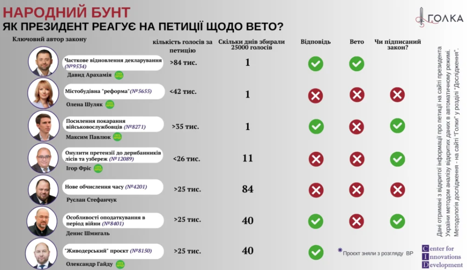“Президент проігнорував дві петиції: щодо ветування містобудівної “реформи” 5655 голови партії “Слуга народу” Олени Шуляк та закону “Про обчислення часу” спікера парламенту Руслана Стефанчука. У часи війни, коли немає виборів, важливо, щоб західні партнери бачили, що у нас діють інструменти цифрової демократії. Президент не може на одні петиції відповідати, а інші ігнорувати, створюючи теплу ванну для Шуляк чи Стефанчука”, – каже голова громадської ініціативи “Голка” Ірина Федорів.