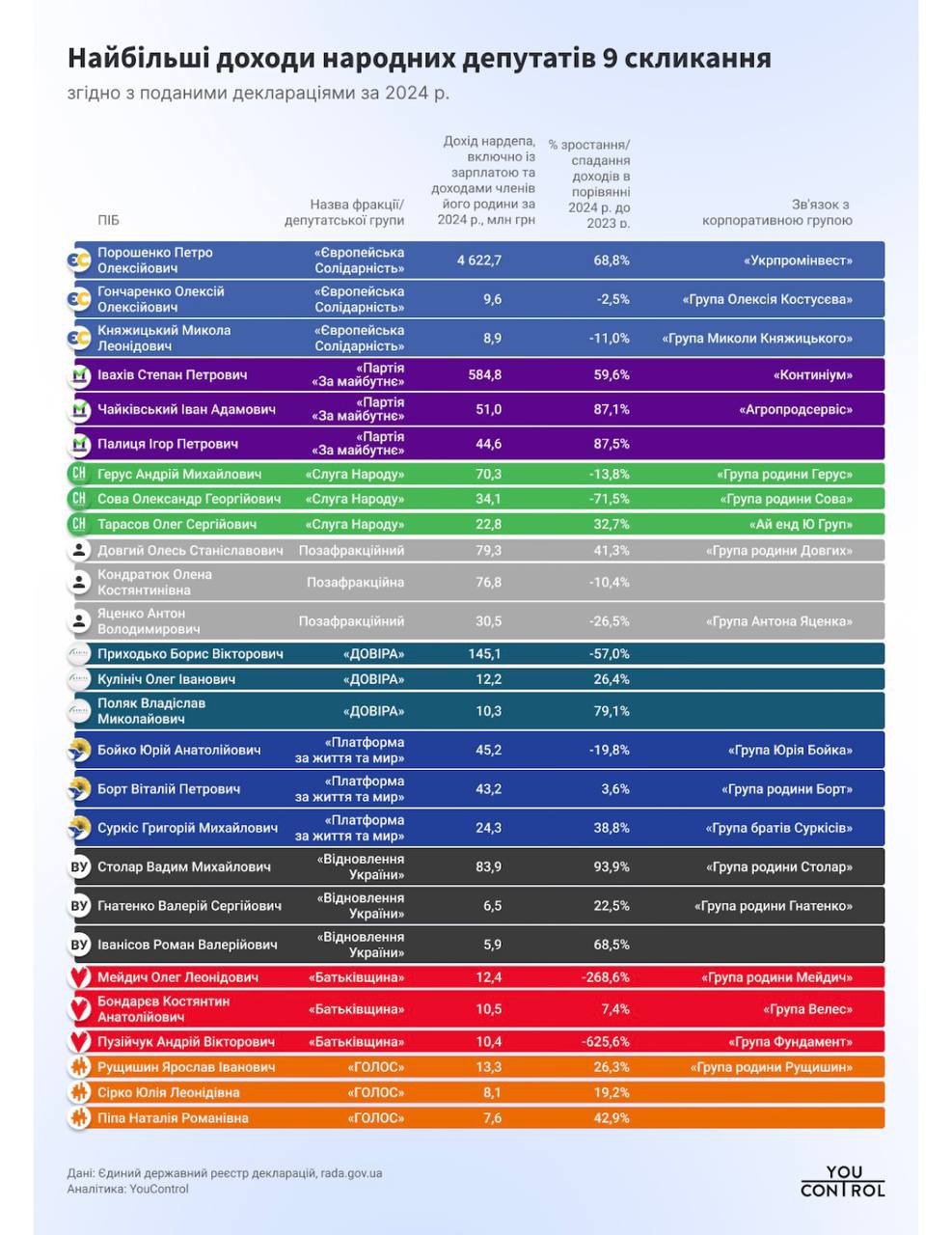 Крім вищезгаданих Гончаренка і Княжицького, згідно з деклараціями, ще у 8 членів фракції “Європейська солідарність” у 2024 році зменшились доходи.