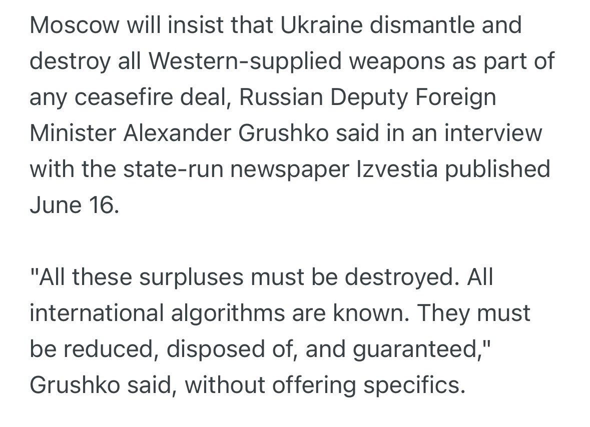 Напередодні в одному із інтерв'ю пропагандистським каналам заступник глави МЗС РФ Олександр Грушко заявив, що у межах будь-якої угоди про перемир'я Москва наполягатиме на тому, щоб Україна знищила всю зброю, надану Заходом.