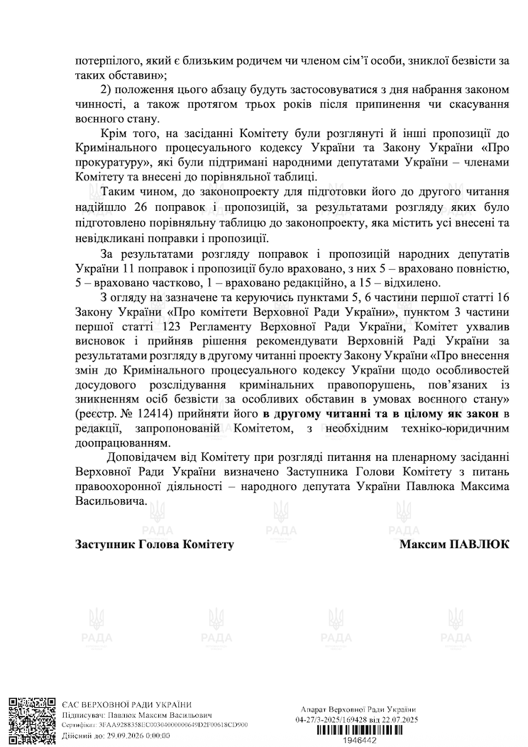 У розпорядженні LB.ua також висновок правоохоронного комітету за підписом автора закону Максима Павлюка ("Слуга народу").