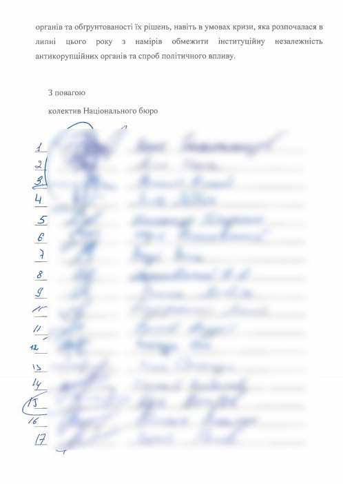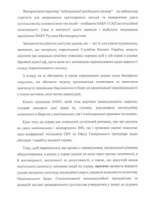 Водночас ми щиро переконані, що події, які відбулися у липні 2025 відносно працівників Національного бюро, є процесуальним свавіллям, зумовленим політичною метою", – йдеться у зверненні.