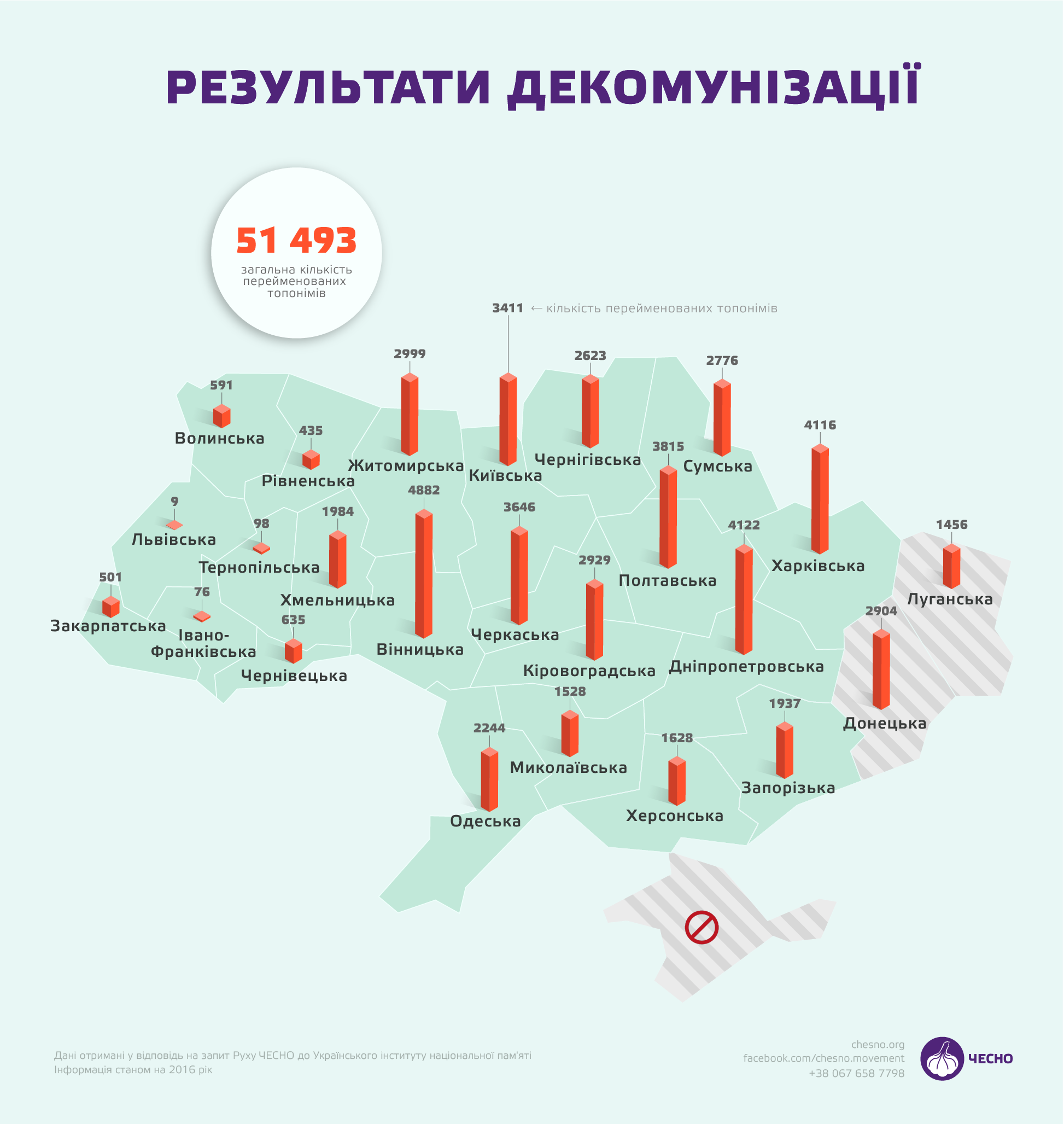 15 квітня 2015 року ВРУ ухвалила закон про декомунізацію. Парламент унормував процес, який стихійно розпочався після Революції гідності. У відповідь на запит ЧЕСНО в УІНП повідомили: тоді перейменували понад 50 тисяч об’єктів топонімії.