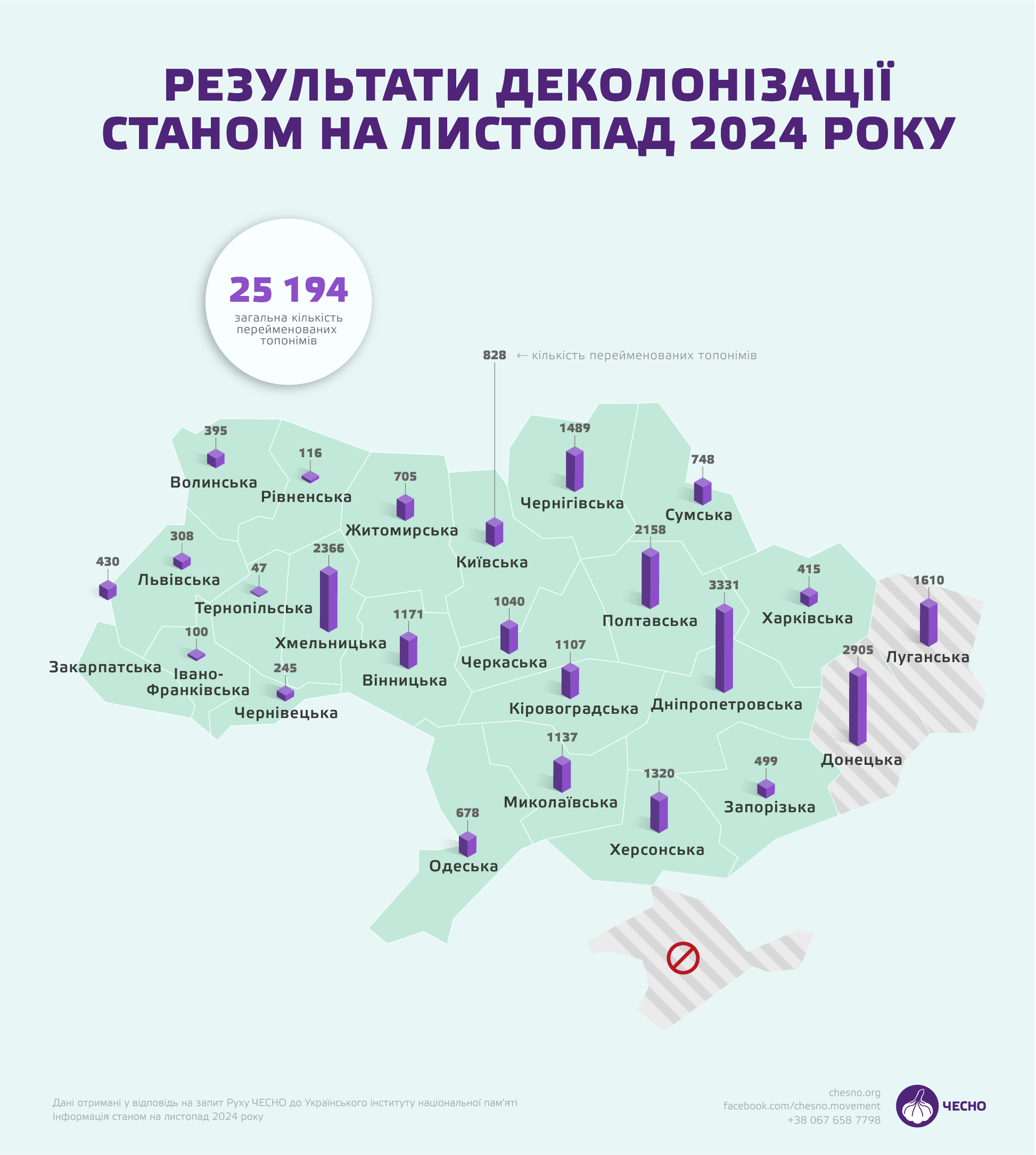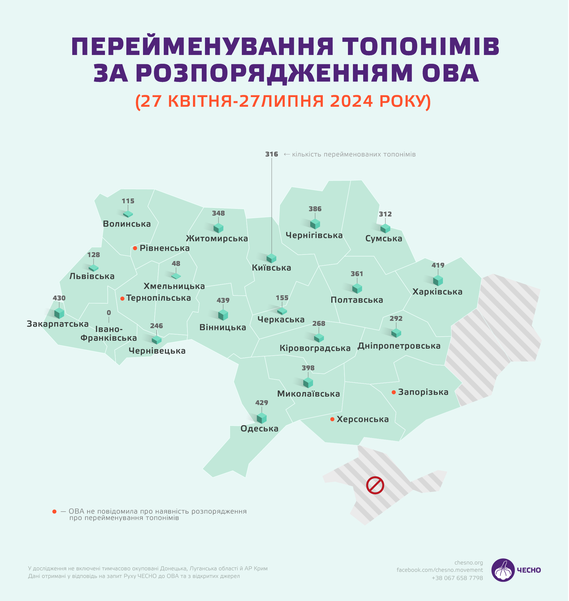 УІНП у відповідь на запит ЧЕСНО повідомив: «Інститут не є розпорядником інформації щодо загальної кількості перейменованих в Україні об’єктів топоніміки». Тож там змогли надати дані станом на листопад 2024 року, які тоді самі отримали від ОВА (цікаво, а яку ж інформацію надавали адміністрації й чому не могли нею поділитися з журналістами?).