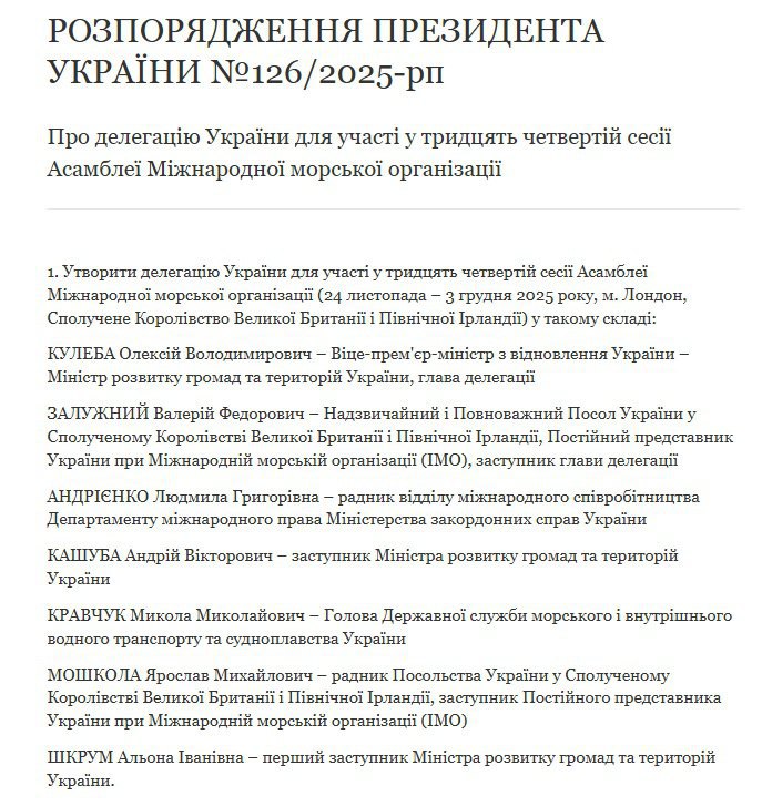 Президент Володимир Зеленський затвердив склад української делегації для участі у 34 сесії Асамблеї Міжнародної морської організації (IMO), яка проходитиме з 24 листопада по 3 грудня в Лондоні.