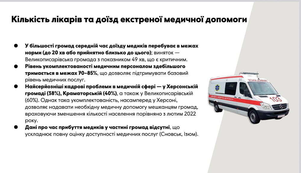 У більшості громад час доїзду швидкої медичної допомоги перебуває у межах норм мирного часу (близько 20 хвилин). Виняток — Великописарівська громада з показником у 49 хвилин. Рівень укомплектованості медичним персоналом здебільшого тримається в межах 70–85%, що дозволяє підтримувати базовий рівень медичних послуг.