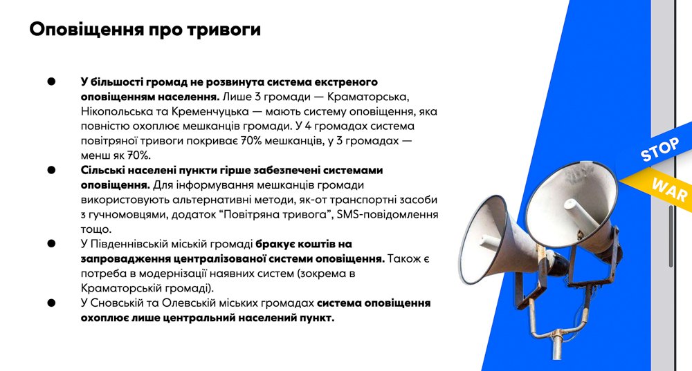 У більшості громад не розвинута система екстреного оповіщення. Лише три — Краматорська, Нікопольська та Кременчуцька — мають систему оповіщення, яка повністю охоплює населення громади. У 4 громадах система оповіщення покриває 70% жителів, у решті — менш як 70%. У Сновській та Олевській міських громадах система оповіщення охоплює лише центральний населений пункт.