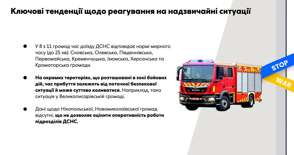 Водночас у переважній більшості досліджуваних громад Національна поліція і ДСНС не лише працюють, укомплектовані та належно приймають виклики на гарячі лінії, а й виконують нормативи щодо прибуття на місце події згідно з нормами мирного часу.