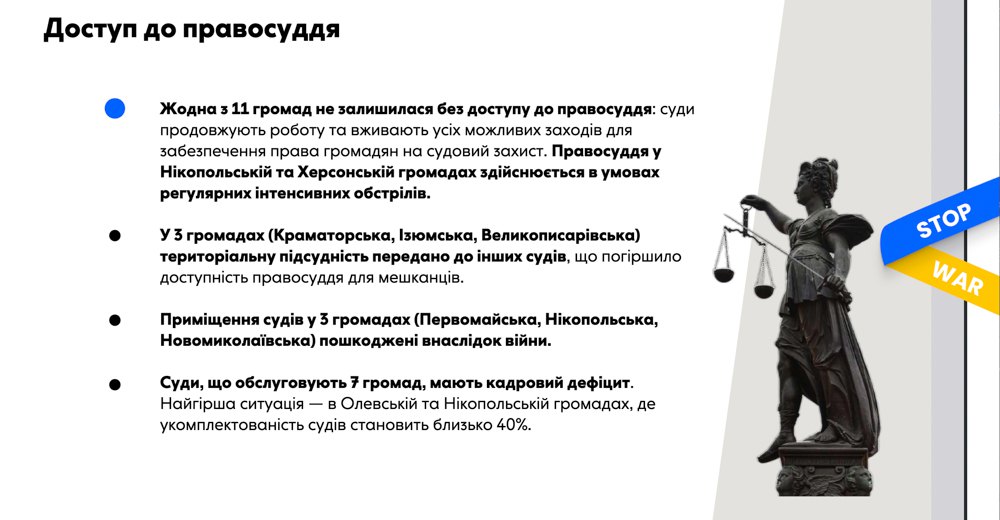Жодна з 11 громад не залишилася без доступу до правосуддя: суди продовжують роботу. Системною перешкодою для їх роботи є повітряні тривоги: 10 із 12 досліджених судів переривають засідання у випадку тривоги, ще 2 — діють за погодженням сторін. Правосуддя у Нікопольській та Херсонській громадах відбувається в умовах регулярних інтенсивних обстрілів. У Краматорській, Ізюмській і Великописарівській громадах територіальну підсудність передано до судів з інших областей, що погіршило доступність правосуддя для мешканців.