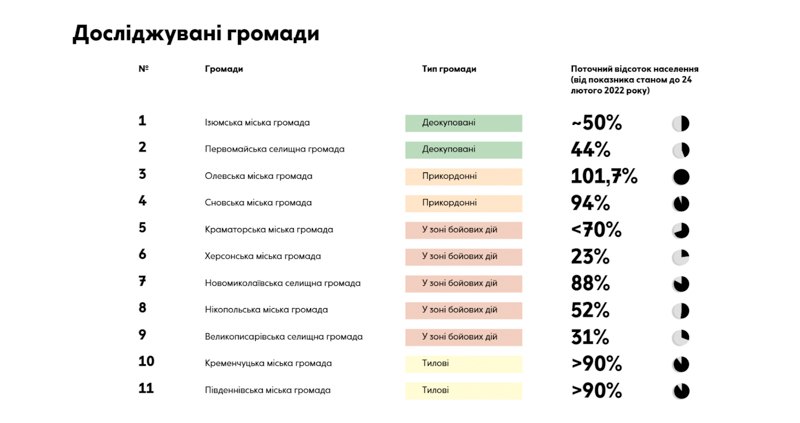 У деокупованих і прифронтових громадах скорочується кількість мешканців — відтік становить 50–75% від довоєнної кількості. Зокрема, у Херсонській громаді залишилося близько 23–25% мешканців, у Краматорській — менш як 70%, у Великописарівській — 31%, у Первомайській — 44%, а в Ізюмській та Нікопольській — близько половини.