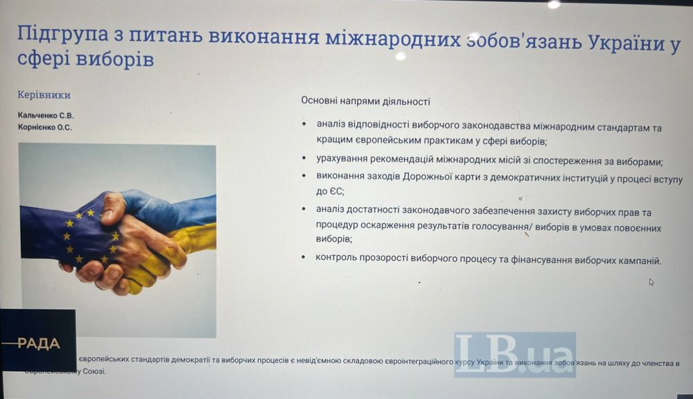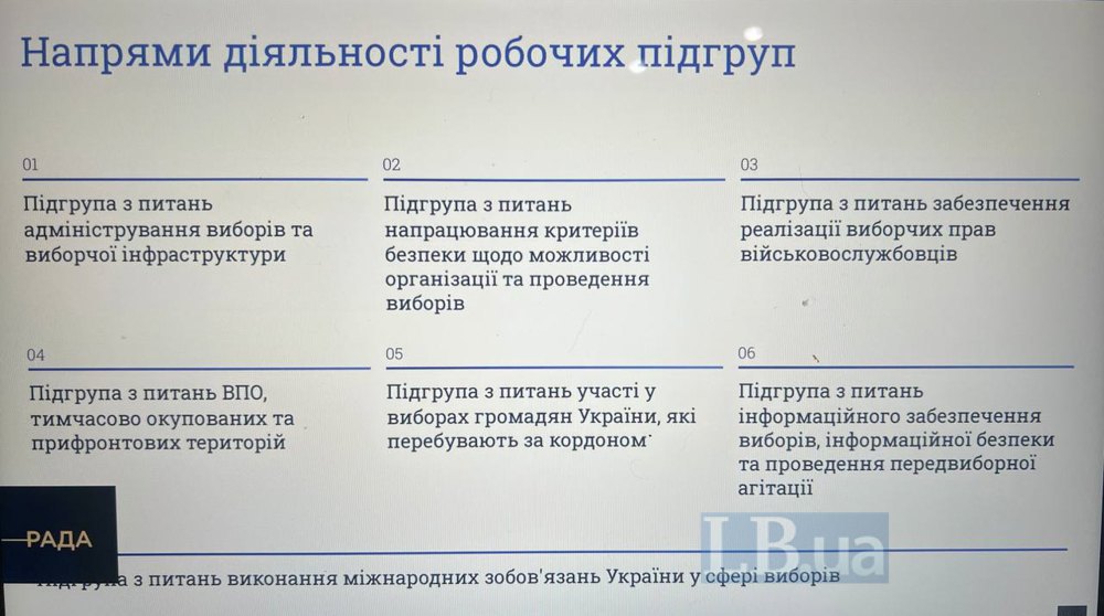 Робоча група з підготовки законодавчих пропозицій щодо особливостей порядку організації та проведення виборів в умовах особливого періоду або повоєнних виборів провела друге засідання. Створено сім підгруп, які мають напрацювати законодавчі зміни за напрямками.