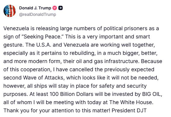 “Венесуела звільняє велику кількість політичних в'язнів на знак «Прагнення до миру». Це дуже важливий і розумний жест”, – написав Трамп у TruthSocial.