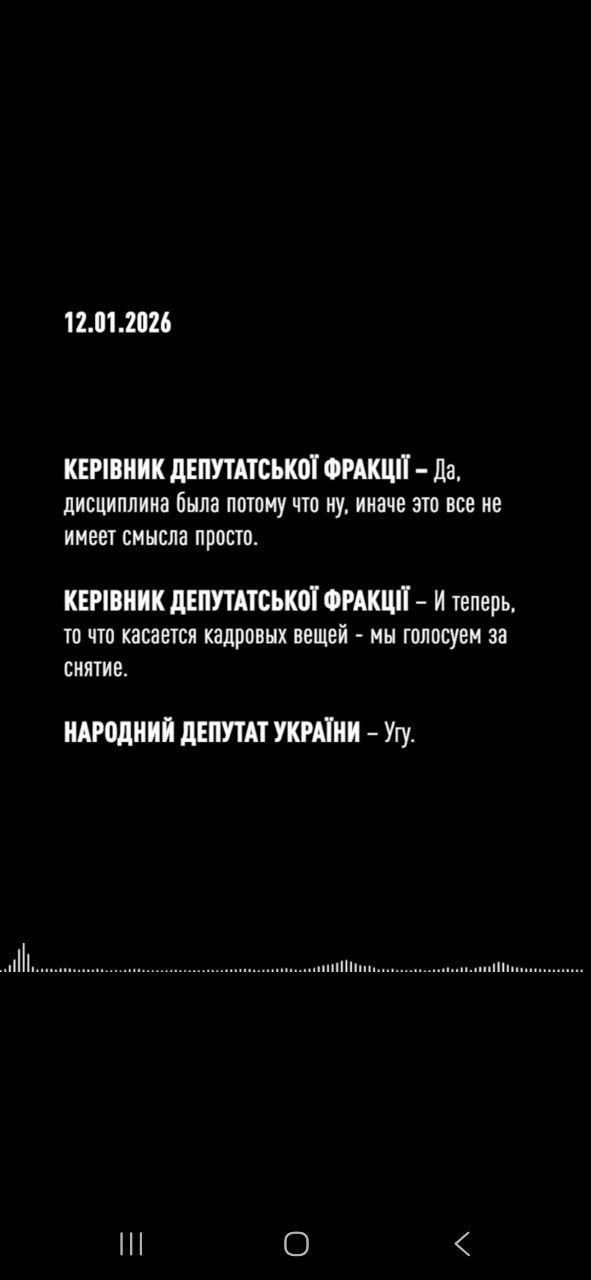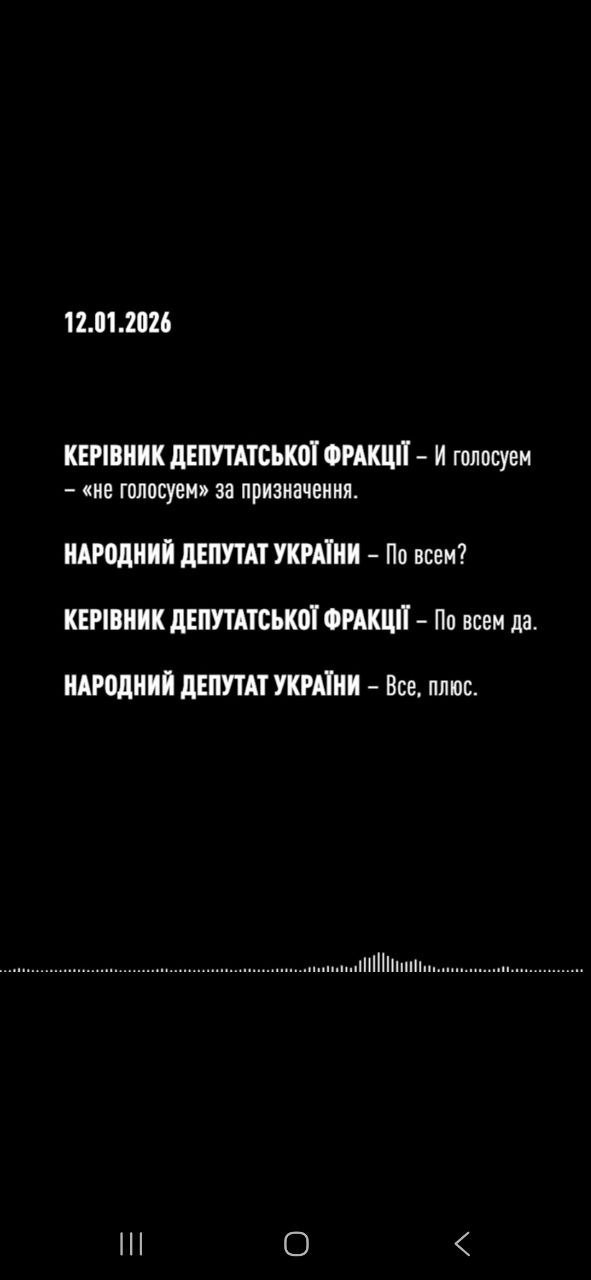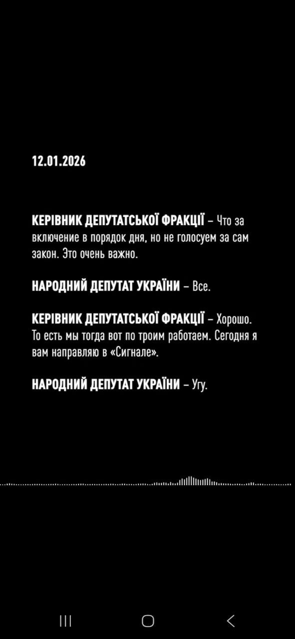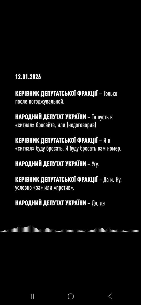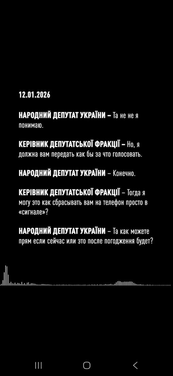 З оприлюднених НАБУ і САП аудіозаписів розмови “керівниці фракції” з невідомим нардепом випливає, що співпраця мала стати тривалою, регулярною і оплачуваною наперед. Також вона сказала співрозмовнику, що вказівки щодо голосування або ж неучасті в голосуванні депутатам мали надавати через месенджер Signal.