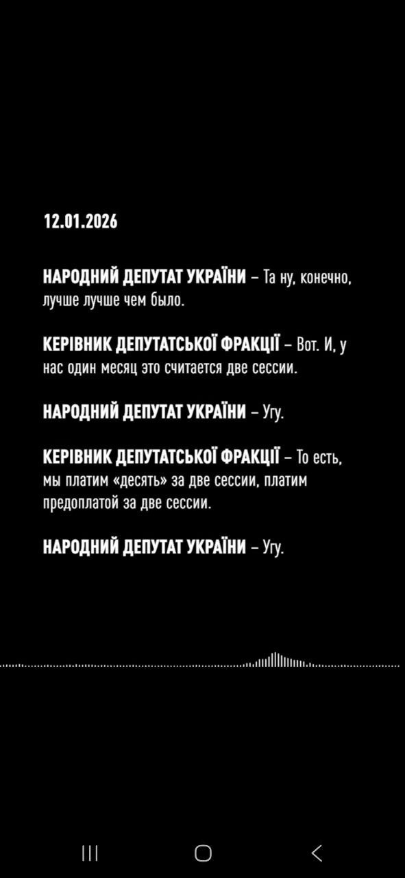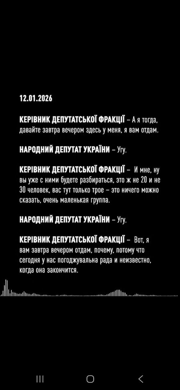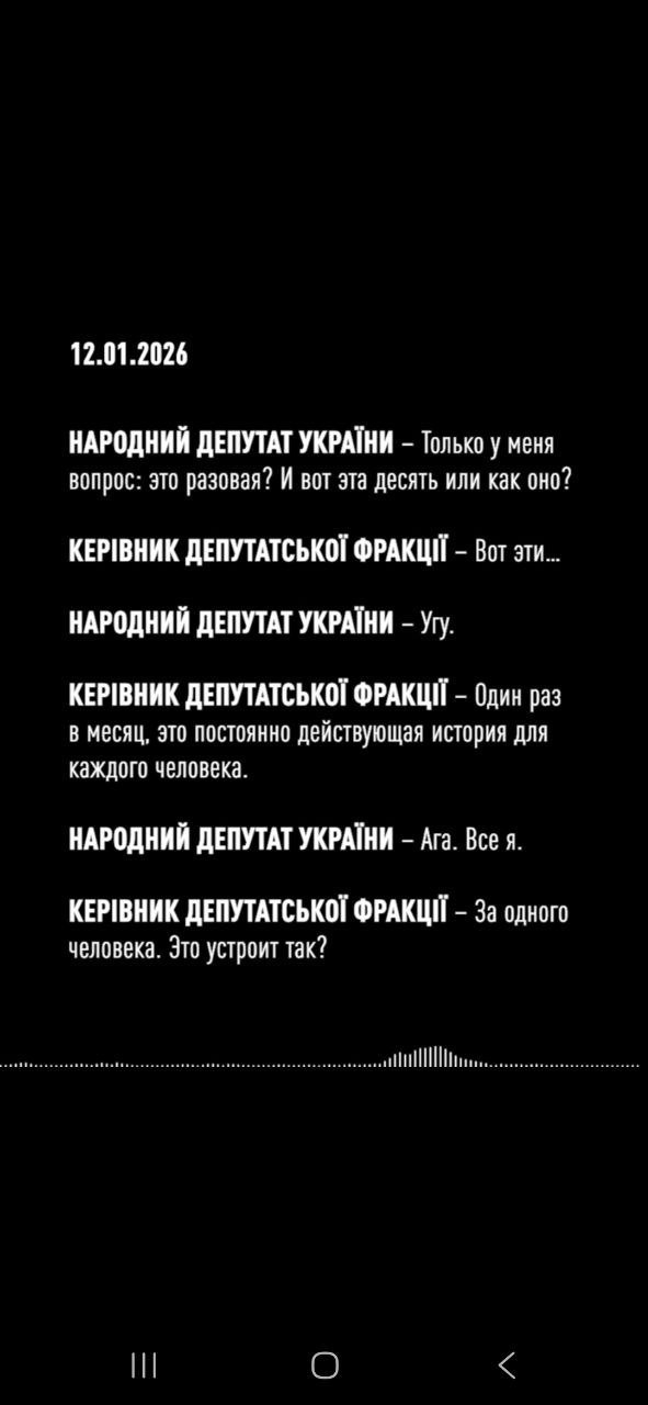 Так, у розмові від 12 січня нардеп уточнював: йдеться про разову виплату чи про системну співпрацю? На що фігурантка скандалу відповіла, що йдеться про “раз у місяць” і то буде “постійно діюча історія” для “кожної людини”.