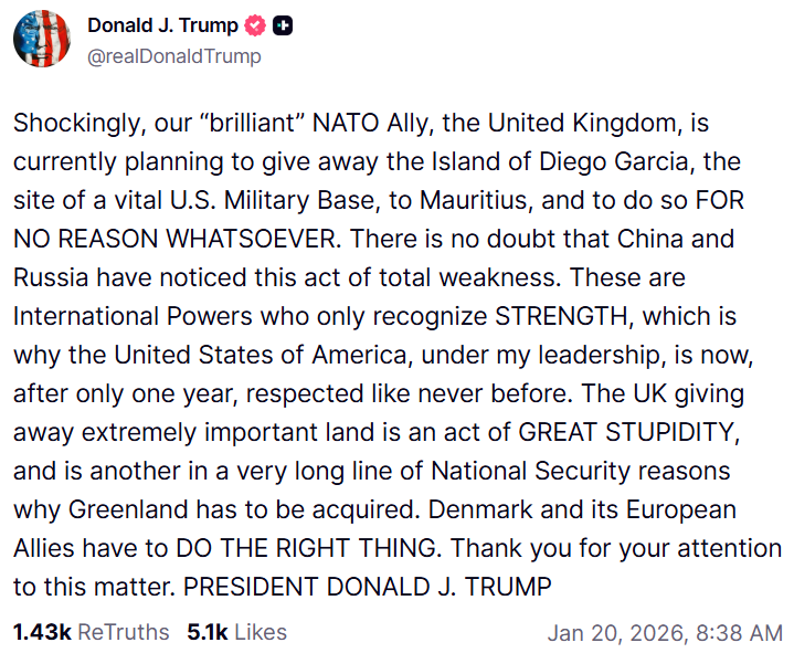 “Шокує, що наш «блискучий» союзник по НАТО, Велика Британія, зараз планує віддати острів Дієго-Гарсія, де розташована життєво важлива військова база США, Маврикію, і зробити це БЕЗ БУДЬ-ЯКОЇ ПРИЧИНИ”, – написав Дональд у TruthSocial.