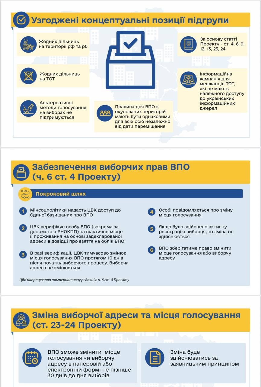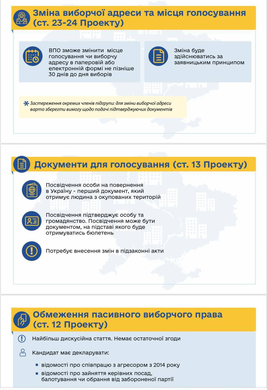 Окремий блок змін стосується громадян, які виїжджають із тимчасово окупованих територій. Проєктом пропонується визнати посвідчення особи на повернення в Україну підставою для отримання виборчого бюлетеня — до моменту відновлення стандартних внутрішніх документів.