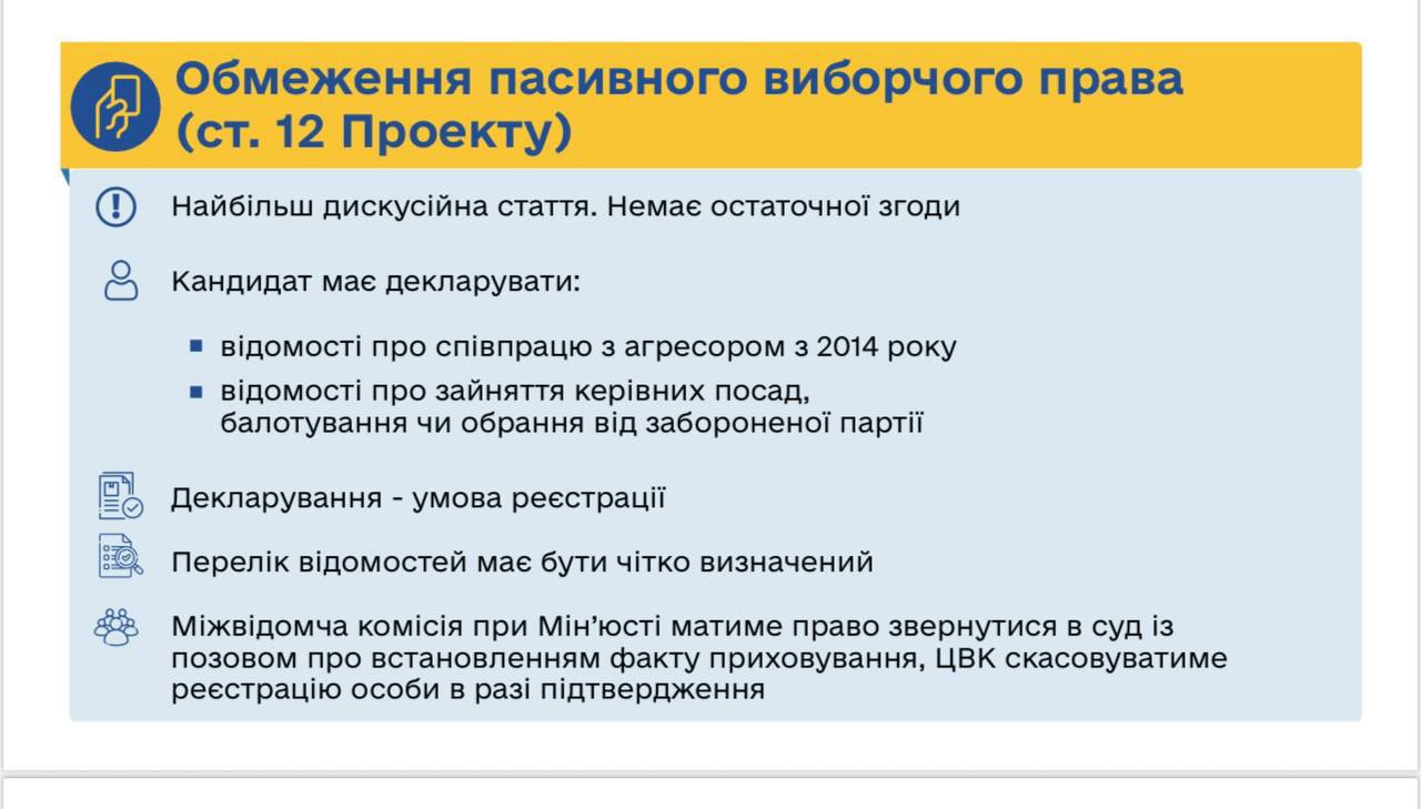 Найбільш дискусійним блоком проєкту є норми щодо обмеження пасивного виборчого права. Кандидатів пропонують зобов’язати декларувати відомості про можливу співпрацю з РФ з 2014 року.