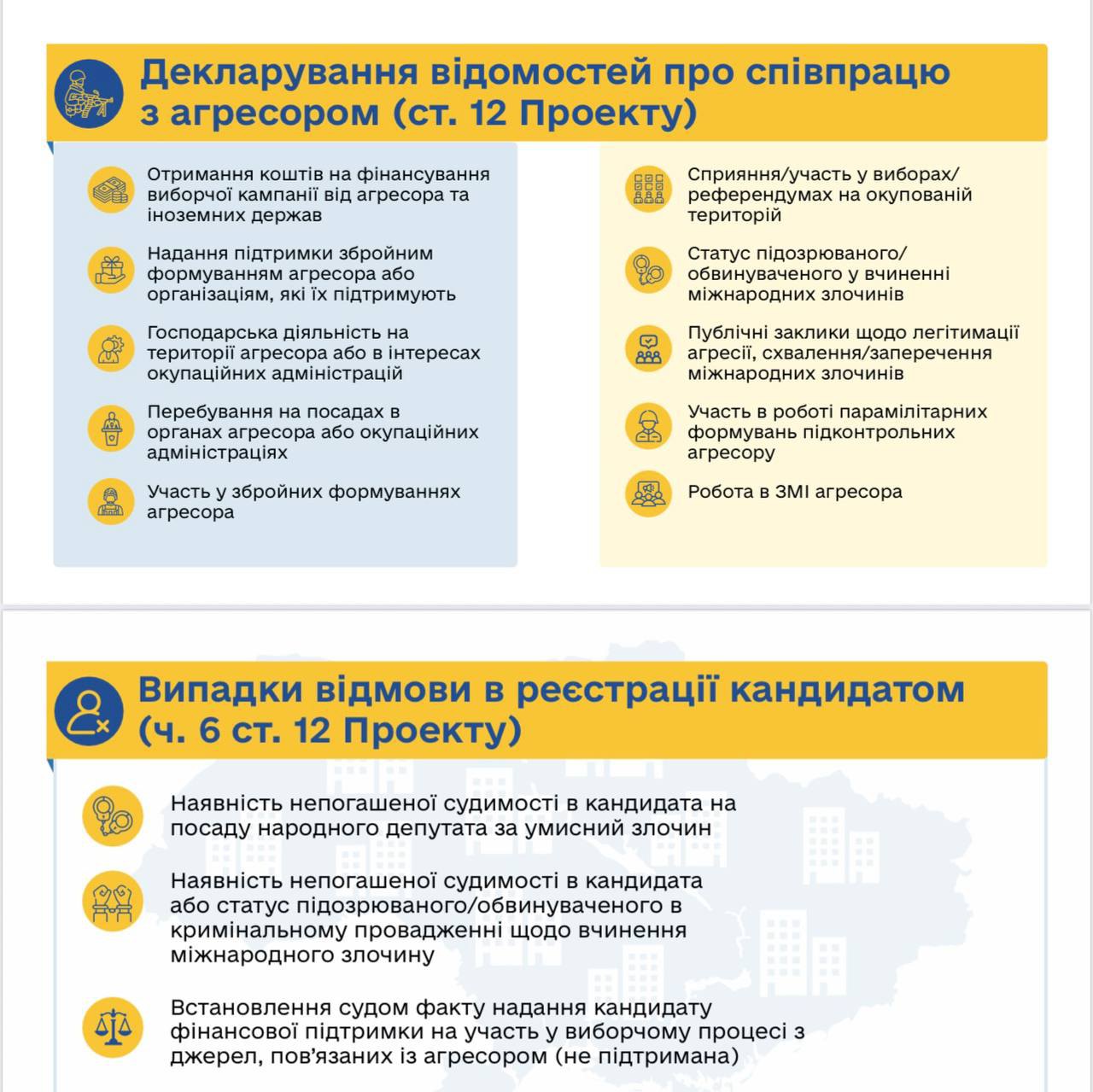 Серед критеріїв — отримання фінансування на виборчу кампанію від агресора, господарська діяльність на території РФ або в інтересах окупаційних адміністрацій, робота в органах влади окупантів, участь у незаконних збройних формуваннях чи пропагандистських медіа, а також публічні заклики до легітимізації агресії.