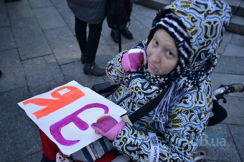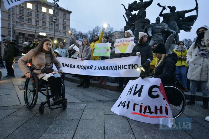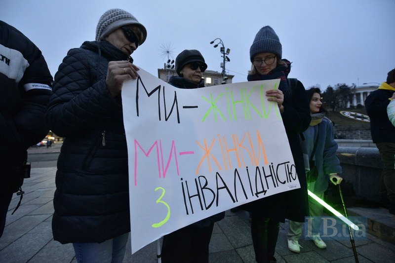 Люди тримали плакати з написами “За права людей з інвалідністю”, “Ми є гідні”, “Ми – жінки з інвалідністю”, “Я є”, “Світ один на всіх”, “Сяйва більшого вимагай”.