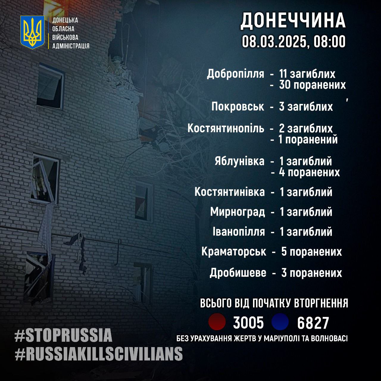 За добу, 7 березня, росіяни вбили 20 жителів Донеччини: 11 у Добропіллі, 3 у Покровську, 2 у Костянтинополі, 1 у Яблунівці, Костянтинівці, Мирнограді та Іванопіллі.