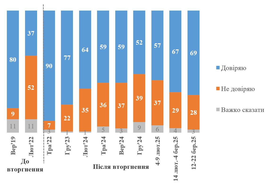 Як йдеться у пресрелізі, станом на другу половину березня 2025 року 69% українців довіряють діючому главі держави, не довіряють – 28%. Баланс довіри-недовіри становить +41%.