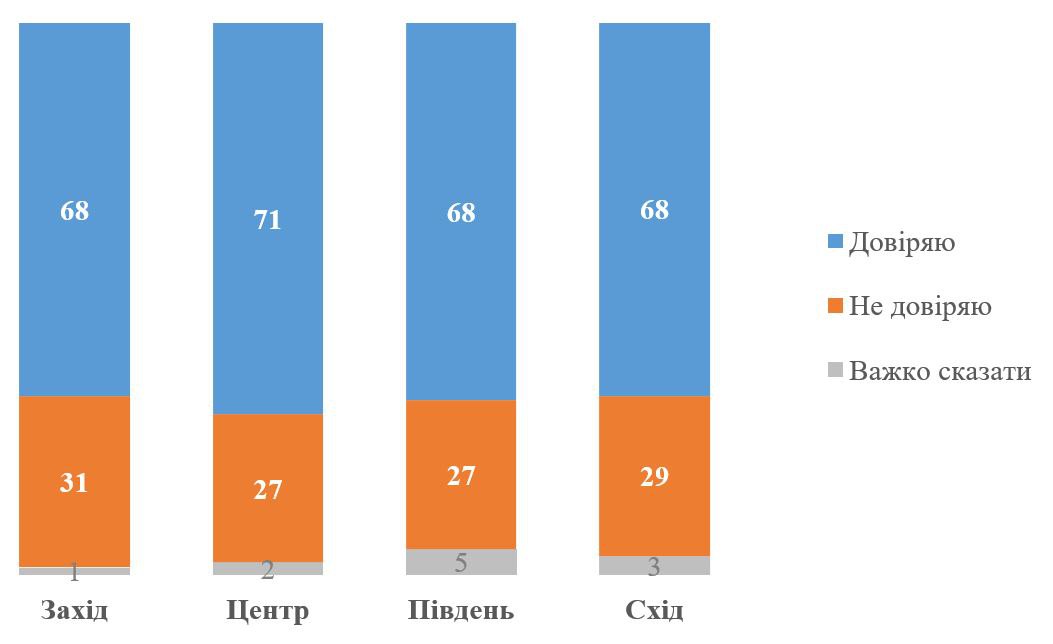 У всіх регіонах України ситуація подібна і баланс довіри-недовіри – позитивний. Зокрема у всіх регіонах частка тих, хто довіряє, становить 68-71% (а частка тих, хто не довіряє – 27-31%).