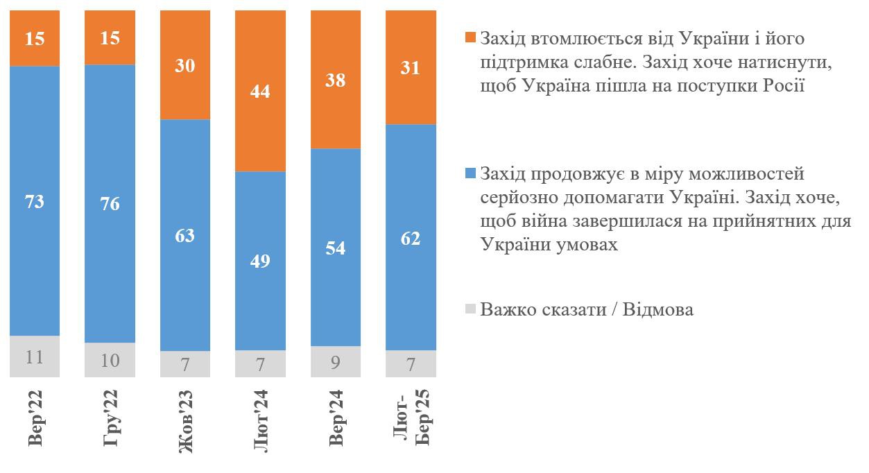 Якщо у наприкінці минулого року українці мали обережні та навіть стримано оптимістичні оцінки, то вже з лютого 2025 року вони погіршилися: у першому випадку 31% опитаних вважали, що при Трампі Україна може розраховувати на скоріше чи зовсім несправедливий мир (причому також не так багато очікували і на скоріше чи повністю справедливий мир, а значна частина мали невизначені очікування, які включали в себе і очікування на принаймні часткову справедливість для України).
