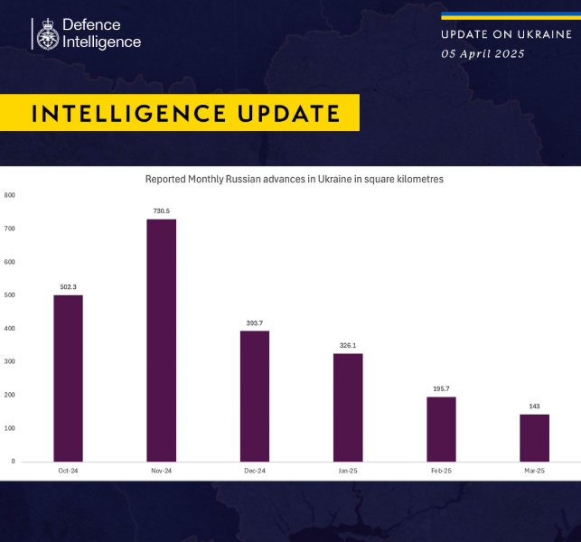 Міністерство оборони Великої Британії із посиланням на дані своєї розвідки повідомляє, що темпи просування Росії в Україні знижуються щомісяця з листопада 2024 року.